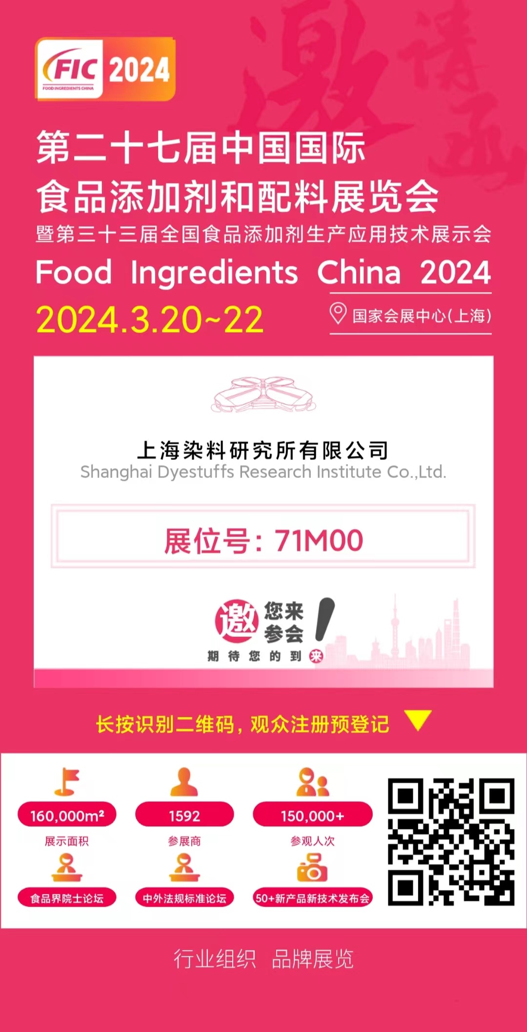 FIC展经过二十多年的培育发展已经成为了国际化、专业化、最具行业凝聚力的食品添加剂和配料行业的品牌展览会,倍受国内外行业同仁的青睐,本次展会将有1591家参展商,食品界院士论坛,中外法规标准论坛,57场新产品新技术发布会。FIC展已经起到了食品添加剂和配料国内外市场需求变化的晴雨表作用,各位客户可扫描附图的二维码参观展会,我司以中国食品添加剂着色剂专业的、安全的制造商和服务商及FIC重要参展商的身份,将在国家会展中心(上海)7.1展馆71M00展区等候您的亲身关注与体验。